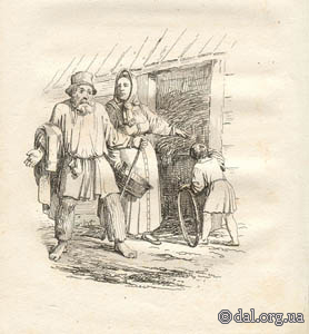 Чуть сзади него женщина, одетая в традиционный русский костюм- аккуратно повязанный платок на голове, рубаха, сарафан, рубаха, лапти. Левой рукой она указывает на открытую дверь сарая. Туда же заглядывает маленький мальчик, спиной к читателю, одетый в длинную рубашонку, босоногий, стриженный в кружок, в левой руке металлический обод, любимая игра детворы, оставленная на время- эта деталь подчеркивает важность случившегося, вызвавшего такую бурю эмоций. Гравюра занимает нижние две трети листа.